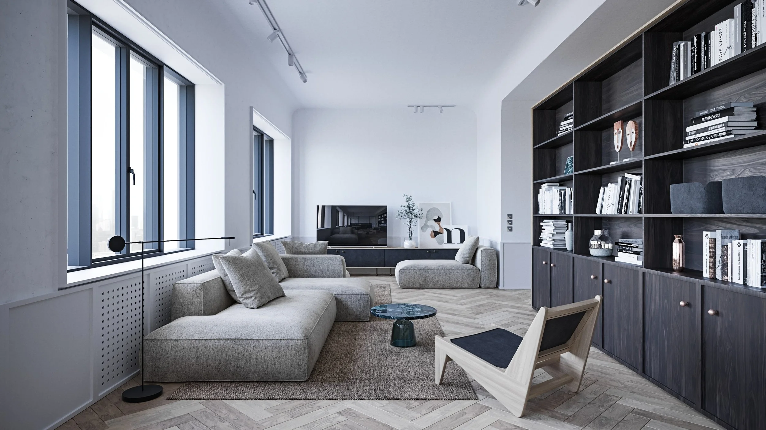 Projekt wnętrza inspirowany stylem skandynawskim - biel, drewno, czerń, kamień. EMTE studio Bydgoszcz